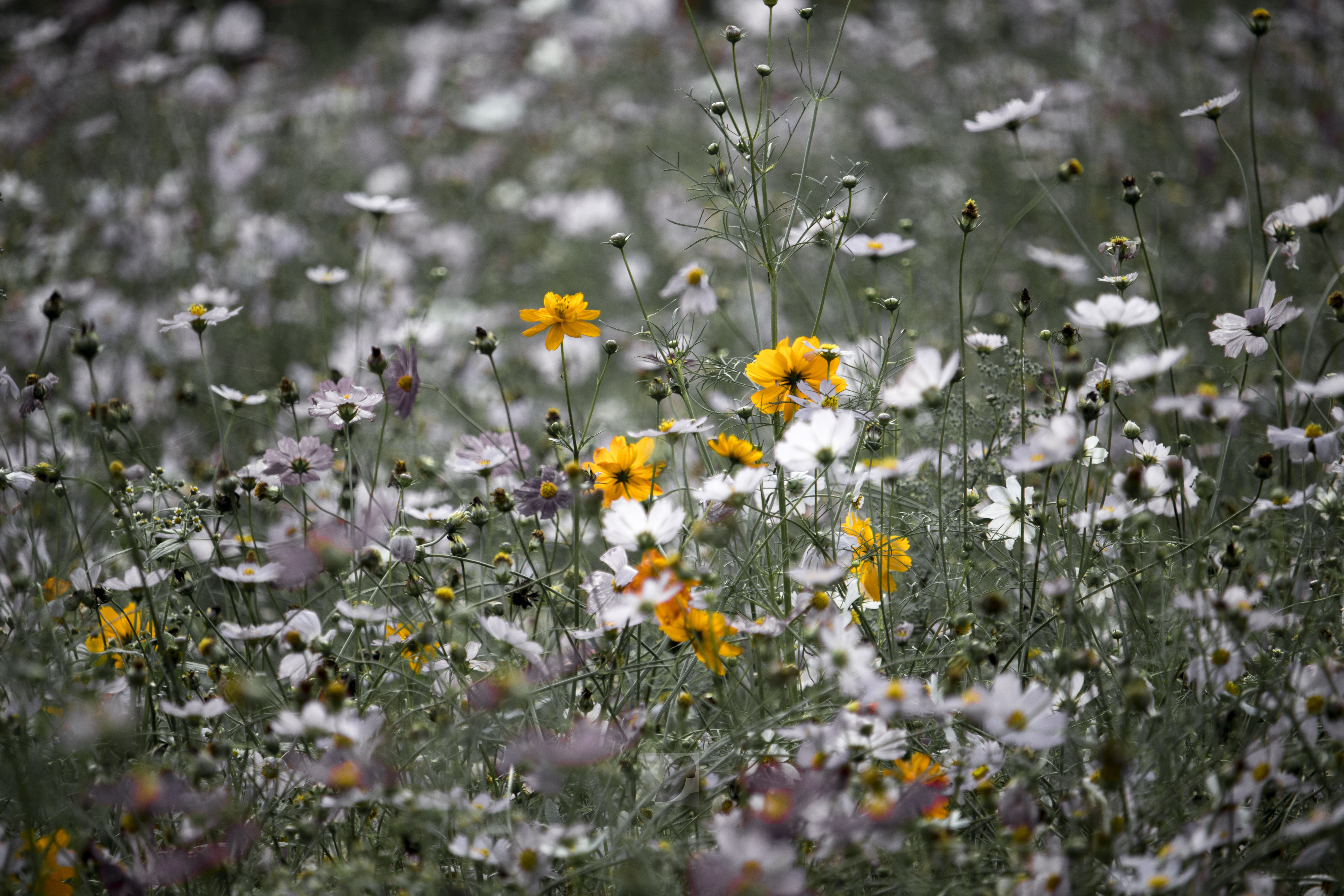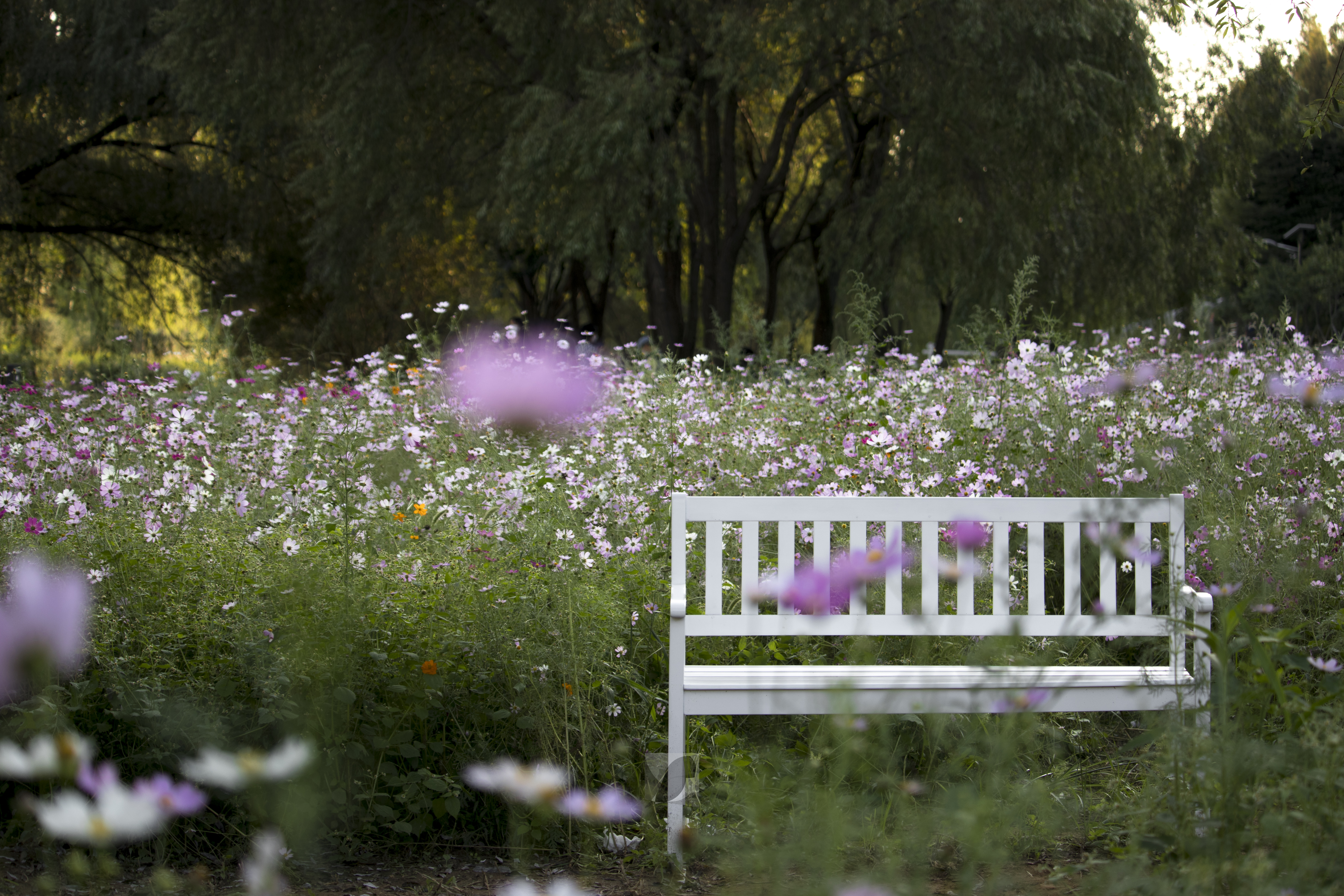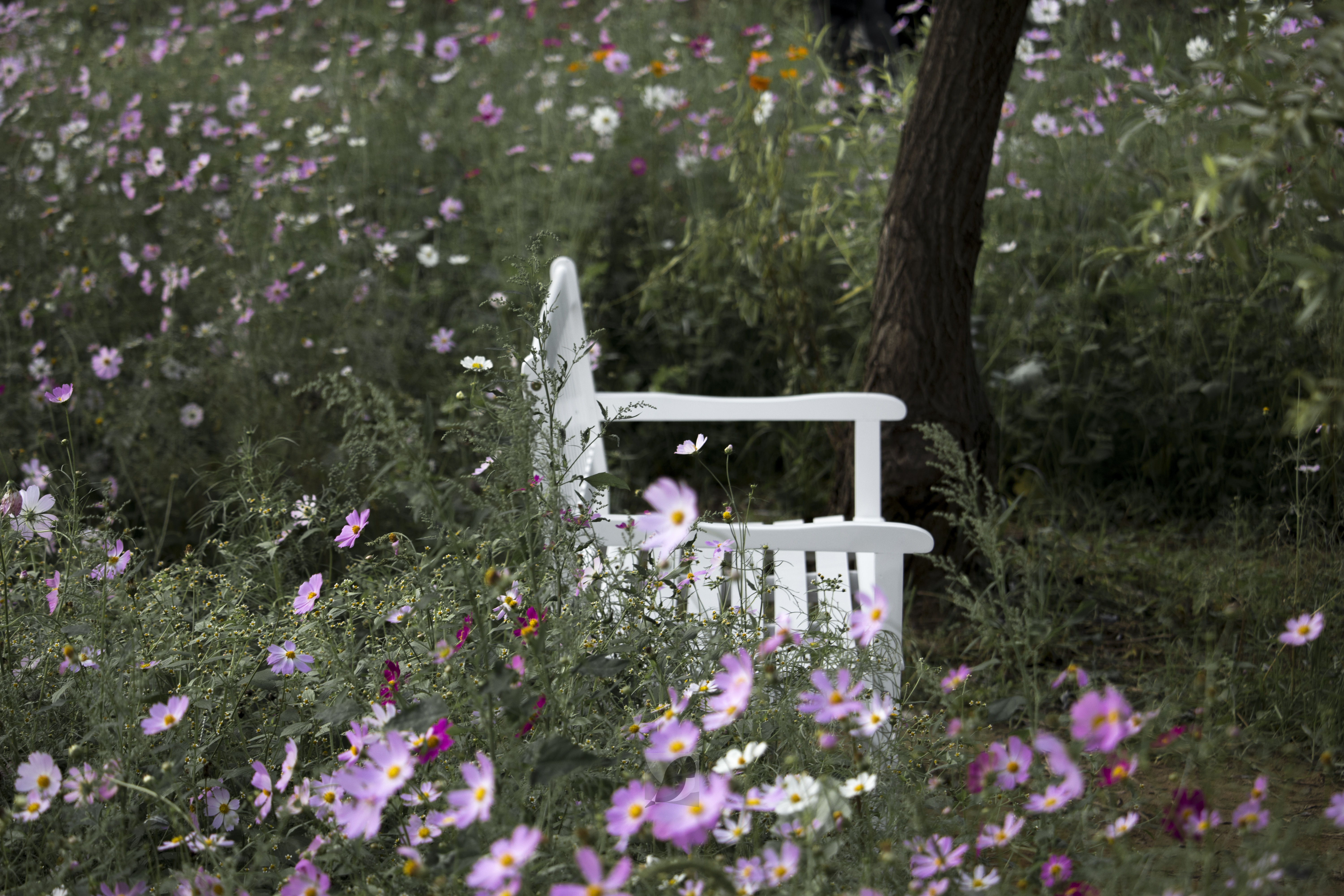 흰 나무 의자 사이에서 코스모스가 피어 있다. 코스모스 사이에서 인상적인 황색 코스모스.